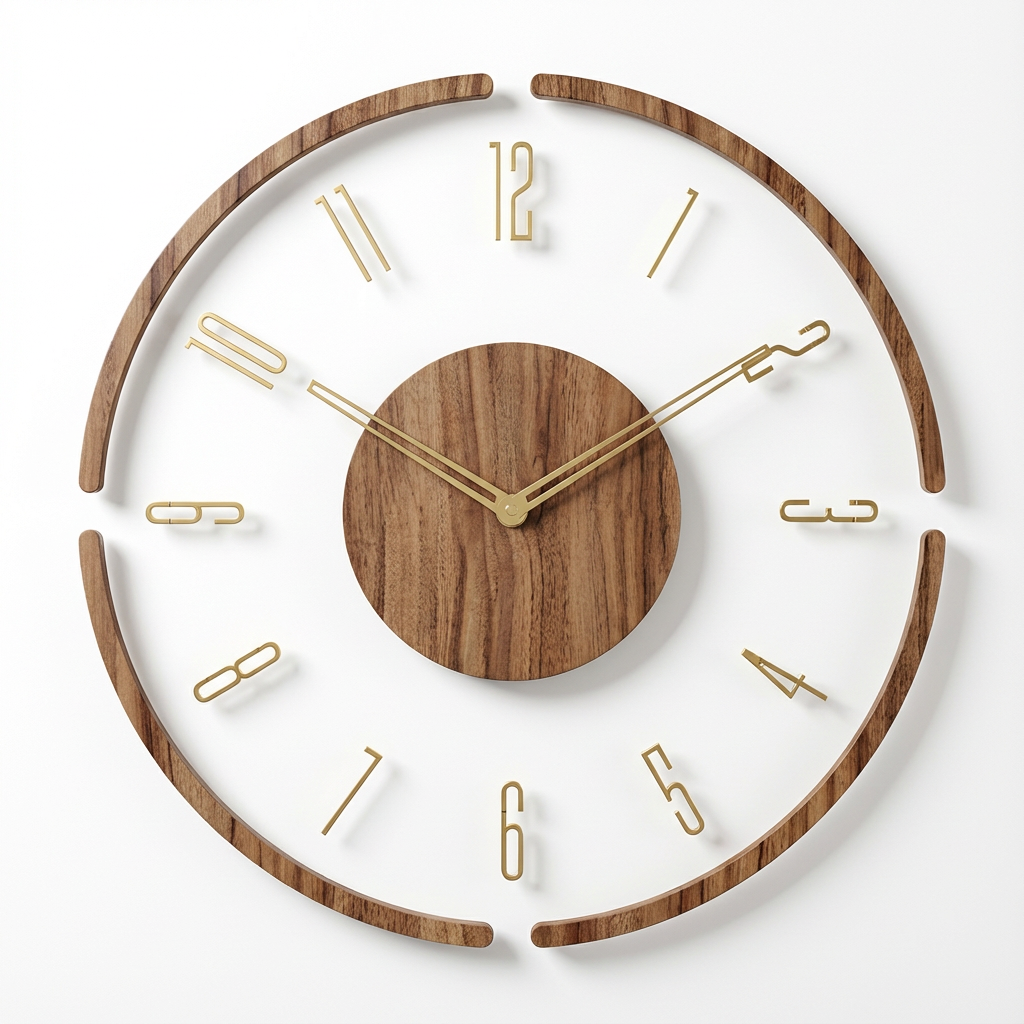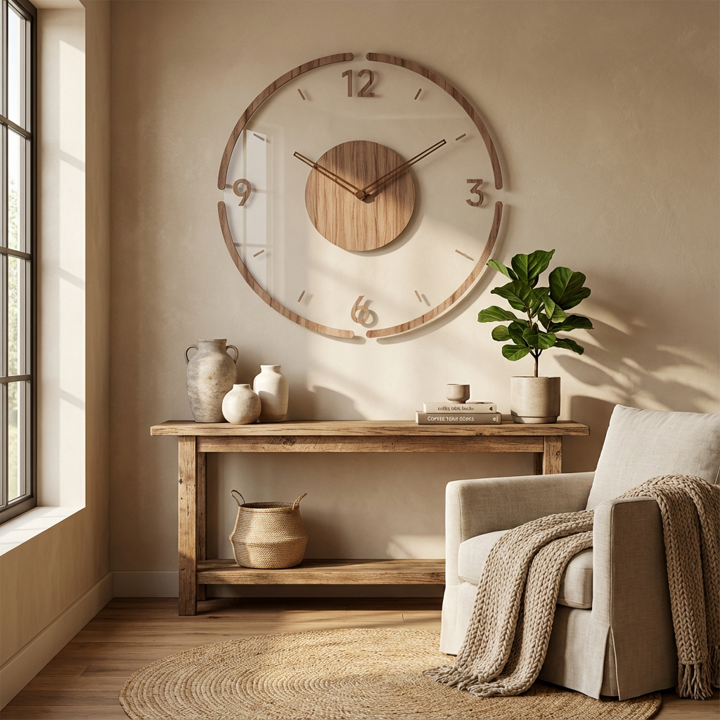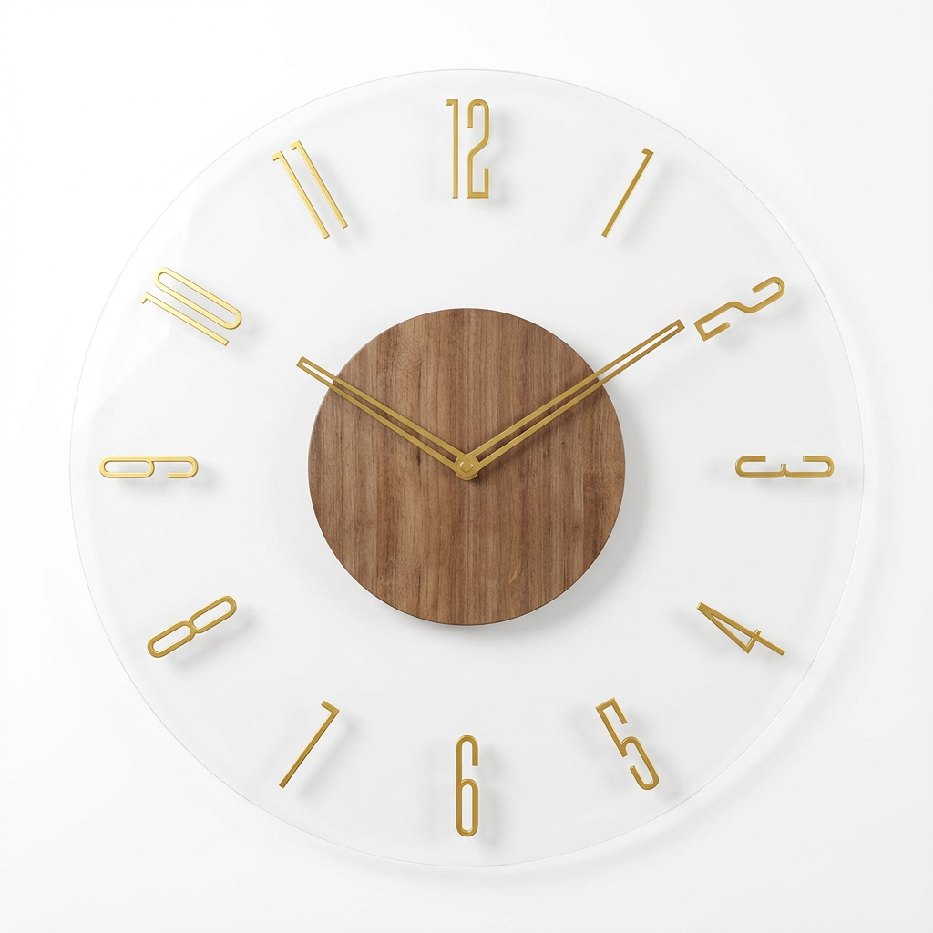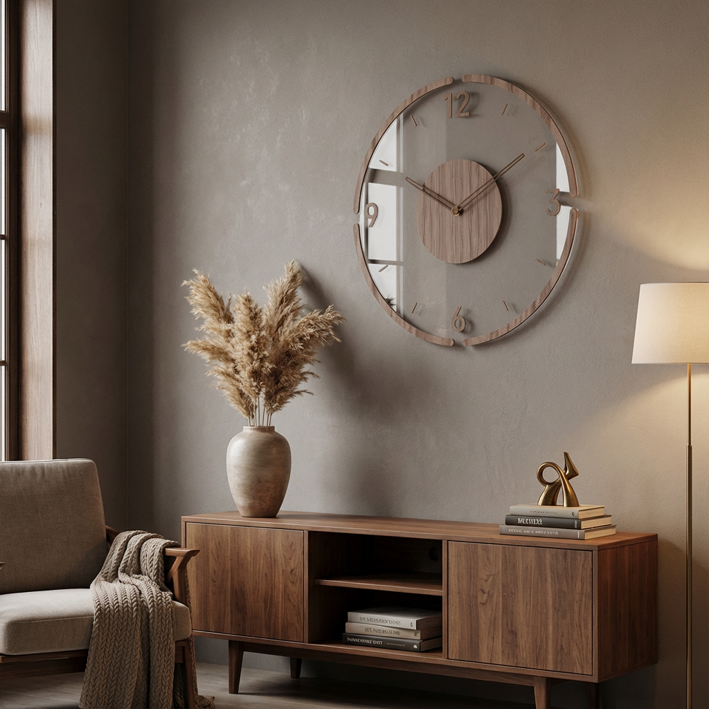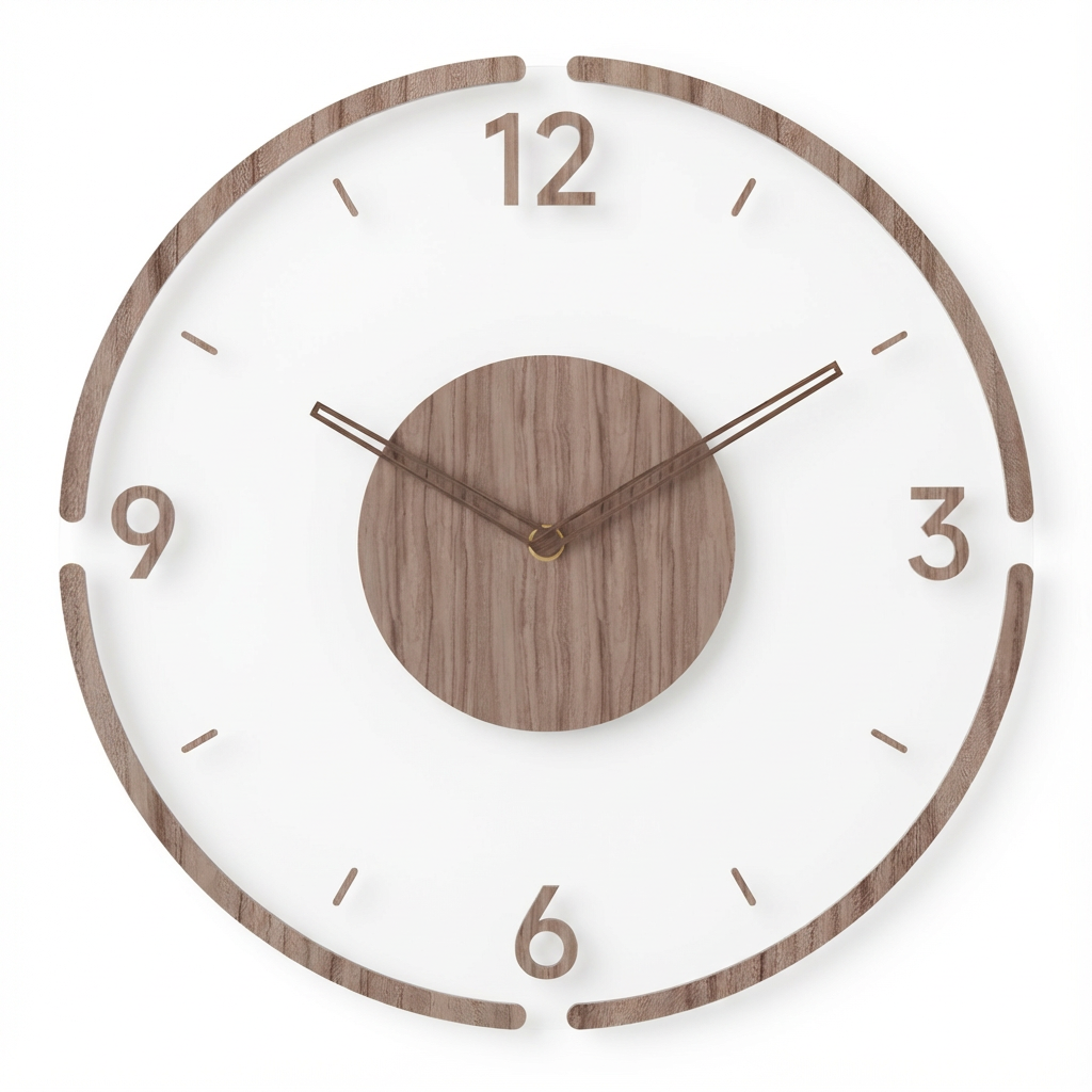 Dette moderne vægur forener nordisk minimalisme med varme naturmaterialer og skaber et stilrent fokuspunkt på væggen. Kombinationen af transparent akryl og naturligt træ giver uret et let og elegant udtryk, der passer smukt ind i både moderne og klassiske hjem. Det lydløse urværk sikrer en rolig atmosfære, hvor design og funktion går op i en højere enhed.