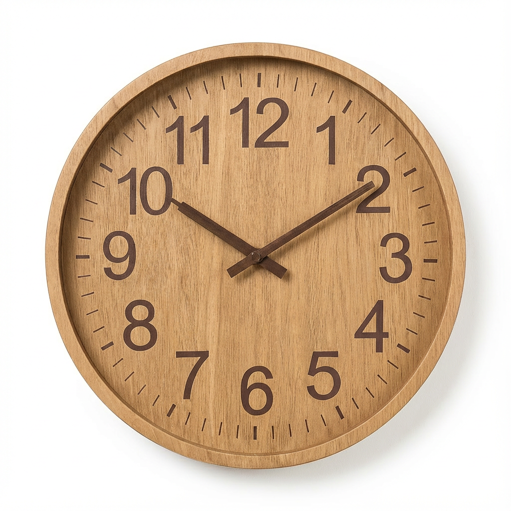 - Minimalistisk skandinavisk design med tydelige tal og varm træstruktur