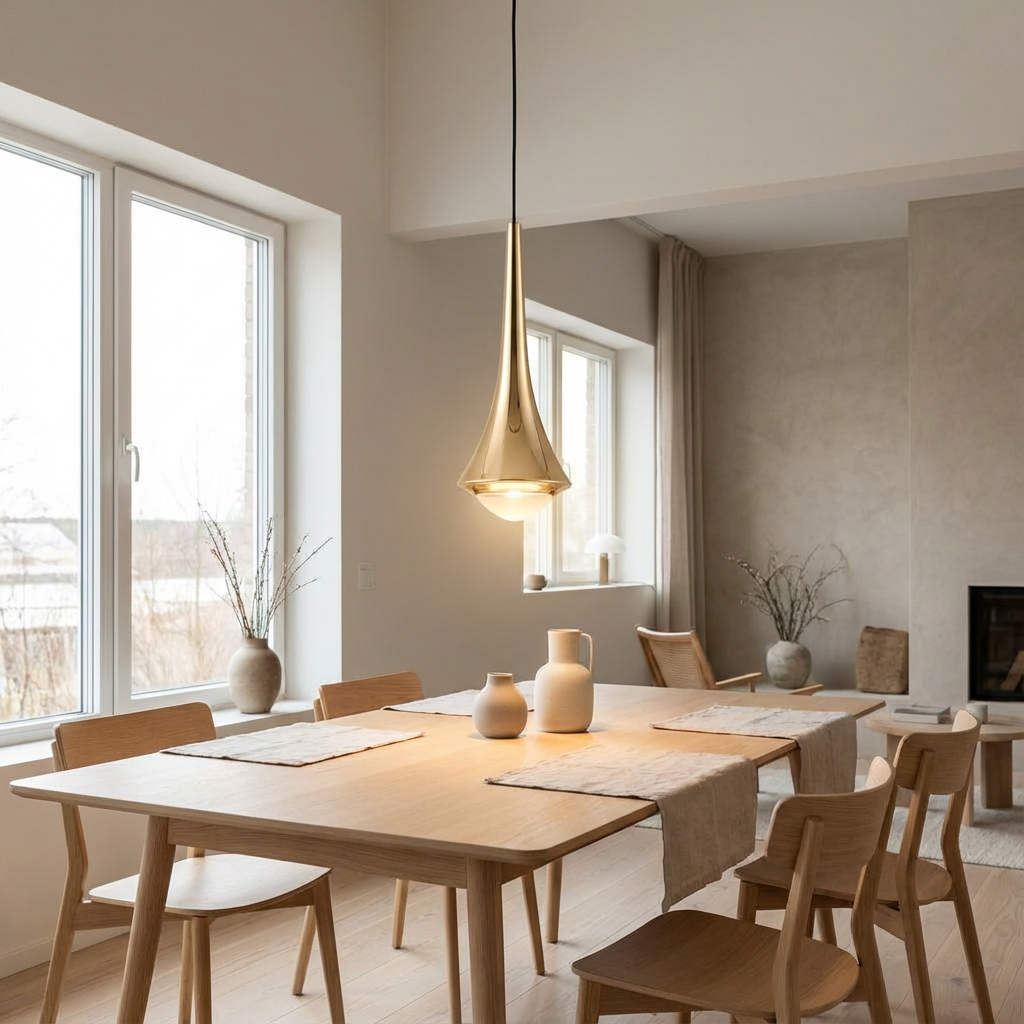 Tilfør dit hjem et elegant og skulpturelt udtryk med denne moderne pendellampe i tåreformet glas. Det slanke design med glat glas og raffinerede metaldele giver et eksklusivt og roligt udtryk med tydelig nordisk og skandinavisk æstetik. Det bløde LED-lys med justerbare farvetemperaturer skaber en indbydende atmosfære, der passer perfekt til både afslapning og fokus.